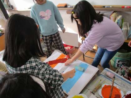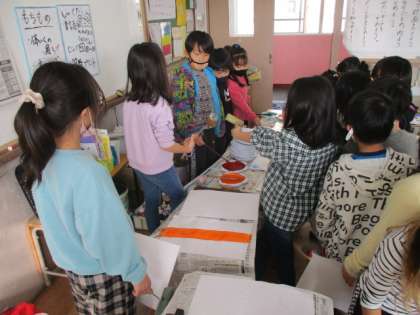 版画の型紙が仕上がった子から、半紙にローラーやスタンプを使って、模様をつけていきました。