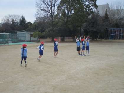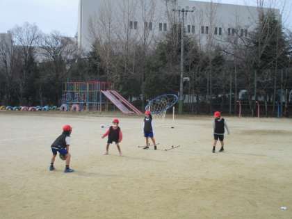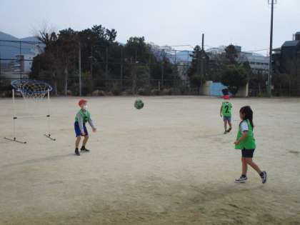 ルールや進め方については2学期のパスゲームと同じなので、今回は「パスの仕方」についてパスを「出す方」と「もらう方」の動き方などをたくさん考えてプレーしていくことを大切にしていこうと声かけをしました。