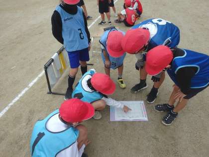 この日から対抗戦が始まりました。同じ相手と試合を重ねていきます。チームの時間には,相手チームのよいところや弱点について話ながら,自分たちのチームの作戦をかんがえていました。