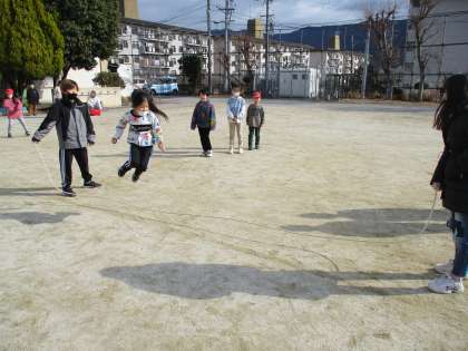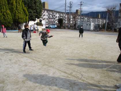 中間休みにたてわりあそびをしました。運動場でなわとびをしたり、タグ取りをしたりして楽しく遊ぶことができました。