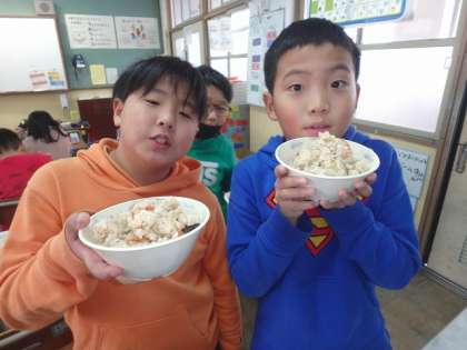 朝にお餅を2つも食べたので,給食が食べられるかな?と心配をしていましたが,どの子もしっかり食べることができていました。