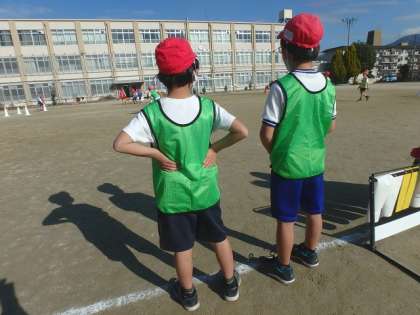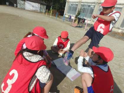 チームの時間には,ボールをどんどん前に進めてシュートが打てるようにと話し合いを進めています。「居残り作戦」のように,それぞれのチームで得点するための作戦を考え試合に生かしていました。