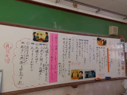 礼儀正しいとはどういった行動をすることかをみんなで話しあい,相手を思いやる心を礼によってあらわすことが出来ることや,礼を大切にすることで,相手を気持ちいい思いにさせることに改めて気づくことが出来ました。