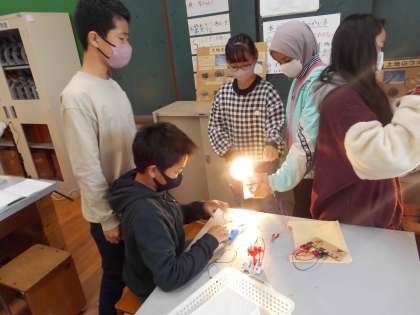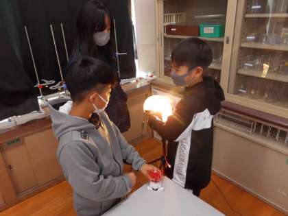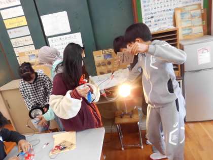 理科では,光を当てて電気を作る「光電池」を使った実験をおこないました。