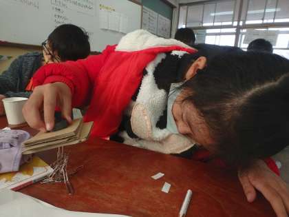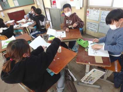 磁石と鉄の距離が変わると,鉄を引き付ける力は変わるのかを予想し話し合いました。いざ実験を確かめてみます!磁石とクリップ(鉄)の間にはさんだ段ボールの数を増やしていくと,引き付けられるクリップの数は少なくなりました。実験をしている時の子どもたち,本当に楽しそうです!