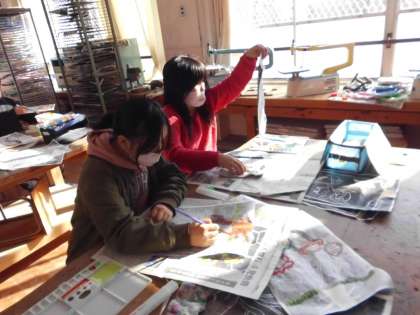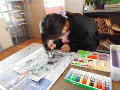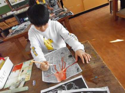 版画では、刷り終わった後に裏側から絵の具を塗り、白い部分に色をつけていきました。絵の具をつけるとじわっと色がうつり、作品がとても華やかになりました。