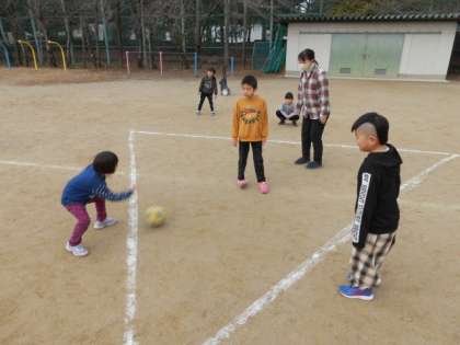 くすのき2のみんなで「ころがしドッジボール」に挑戦しました。ボールに当たらないようによけたり、上手にパス回しをしたりしていました。初めてでしたが、楽しかったようです。