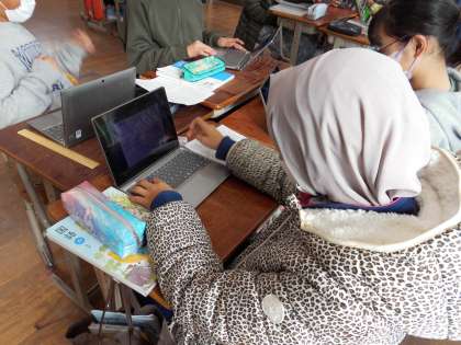 国語の時間に清書した文章を友達と読み合い,交流しました。