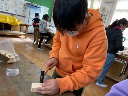 くぎうちトントンの学習が始まりました。まずはテレビを見ながら、金づちの使い方を確かめました。釘を打つときの釘の持ち方や金づちの持ち方を意識して取り組んでいました。