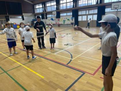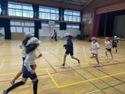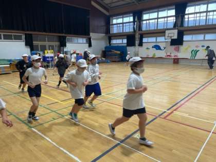 運動場の状態が悪く、体育館で「ジョギング・なわとび」をしました。