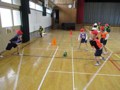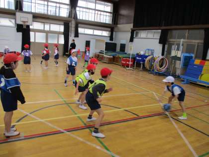 ころがしドッジボールでは、1組と2組で交流試合をしました。お互いのいい所をたくさん見つけて、試合に生かそうとすることができました。