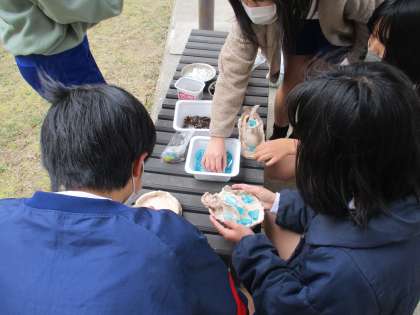 どこにどんな色のガラスを溶かそうかを考えながら配置し,窯に入れました。