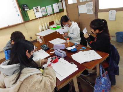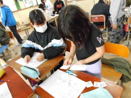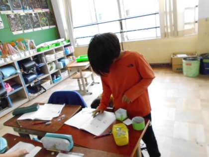 算数では、「直方体と立方体」の学習が始まりました。実際に、直方体と立方体の箱をみんなで作ってみました。