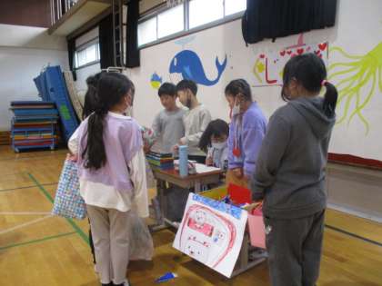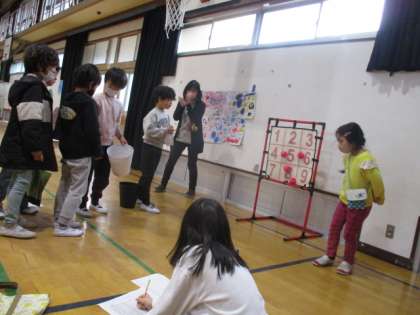 「ボールまと当て」「くじびき」「しゃてき」「ボーリング」「たからさがし」の5つのお店を開いて、1年生に楽しんでもらいました。
