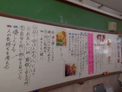 道徳の時間に,ブランコ乗りとピアノの話を通して,「広く受け入れる心」について考えました。