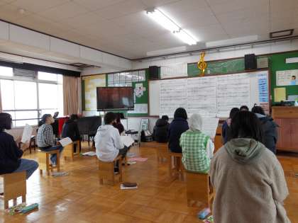 みんな曲を聞くと「いい歌やな〜」としんみに聞き入り,その後はしっかりパートごとの音をよく聞いて歌の練習に取り組んでいました。