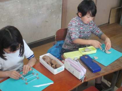 同じ長さのストローが何本ずつ必要か、粘土玉は頂点にするのでいくつ必要かを考えながら、作りました。