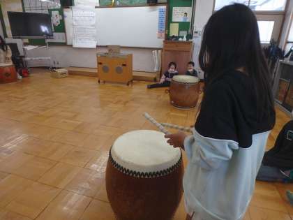 和太鼓で「まつり」という曲を演奏しました。締め太鼓と和太鼓の音色がしっかりと会っていました。叩いている子どもたちも「気持ちよかった!」と話していました。