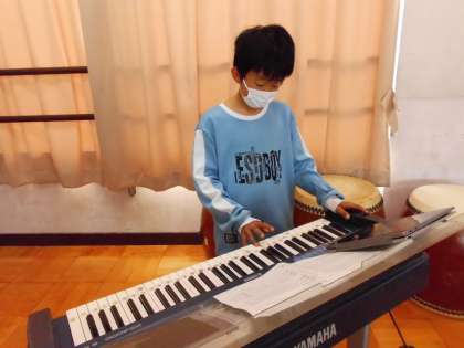 音楽では、「ジッパディードゥーダー」という曲の合奏をしています。まずは、各パートに分かれ練習をしました。