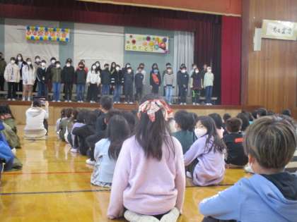 在校生、みんなで言葉とツバメの歌を卒業する6年生に送りました。