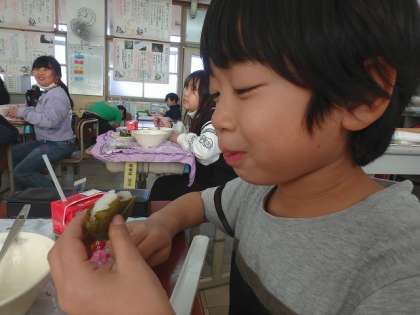 桜餅が出ました。桜の葉と一緒にお餅を食べることができた子が多かったです!