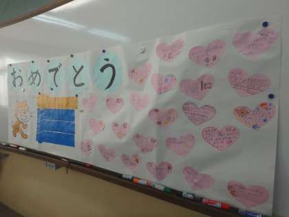 お祝い掲示を作りました。それぞれに6年生への感謝の気持ちを書いていました。