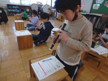 「ラ」「ド」「レ」の音を使って、お祭りの旋律づくりをしました。何度もリコーダーで旋律を演奏しながら、自分のイメージに合う旋律を作ることができたようです。