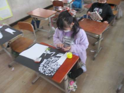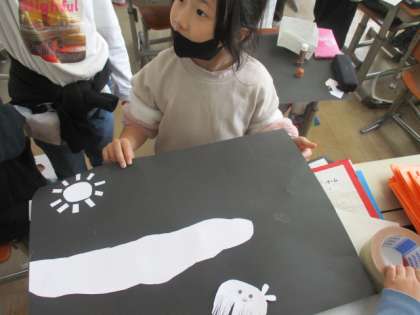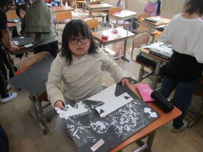はさみで切った形をいろいろと並べながら、見えてくる模様を楽しんでいます。