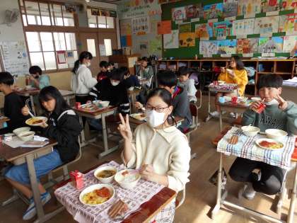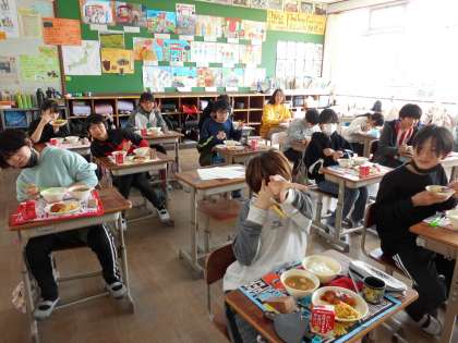 6年生は卒業までに1000回以上も学校給食をいただいているそうです。「給食、おいしいよな。」「給食のお味噌汁が好きやねんな。」などと言いながらお祝い献立をいただいていました。