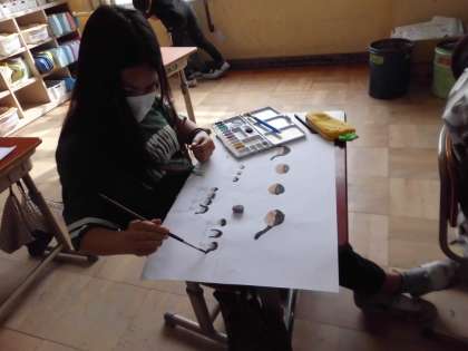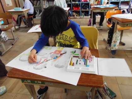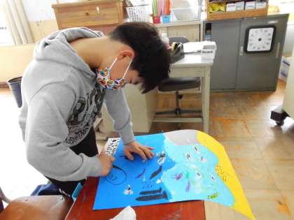 図工では、「わすれられない気持ち」を絵に表現しています。子ども達は、「こんなこともあったよな!」と、この1年をふり返りながら絵を描いていました。