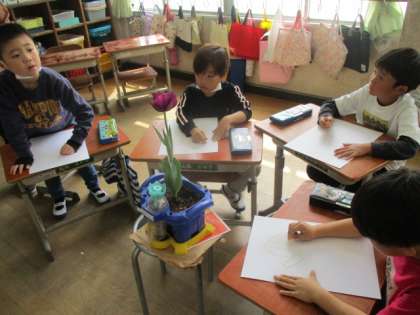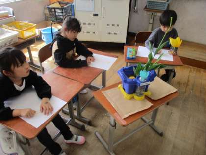 おはなみスケッチの学習をしました。チューリップをよく見てかきました。どれもすてきな作品です。
