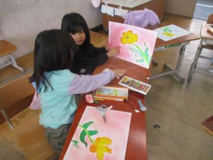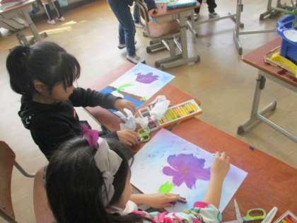お花見スケッチの学習で背景をコンテで仕上げました。色やぬり方にこだわって最後まで丁寧に仕上げることができました。