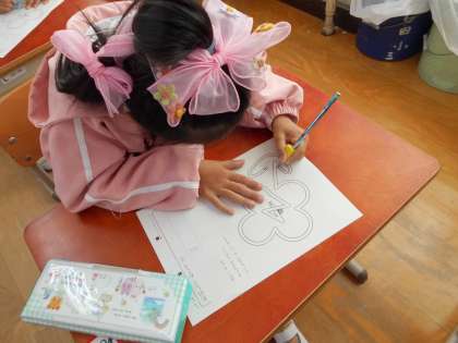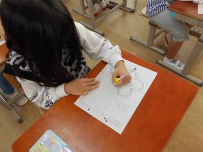 鉛筆の持ち方を知りました。入学前に買ってもらった「はなまるくん」をつけて、正しい持ち方に気を付けながら線を書く練習をしました。