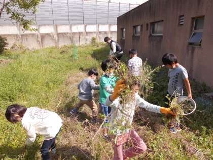 雑草でいっぱいになっていた畑の草引きに全員で取り組みました。