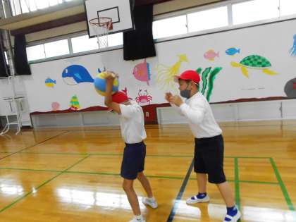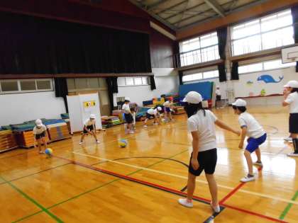 体育の「体ほぐしの運動」では、ボールを使った体ほぐしをしました。ボールを送りあったり、転がしたり、バウンドさせてパスしたりと、様々な方法で楽しみました。