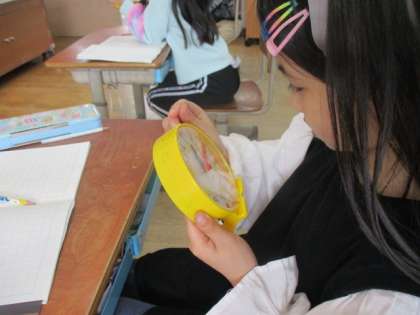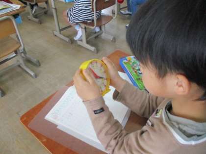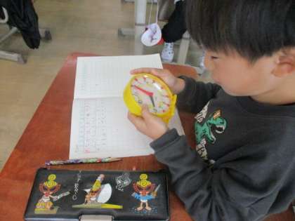 時刻と時間の学習をしています。長い針がどれだけ動くのかに注目して学習しました。