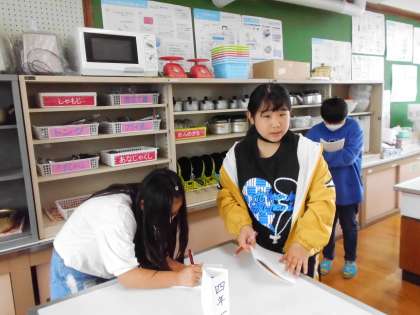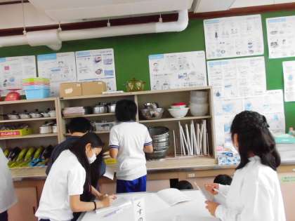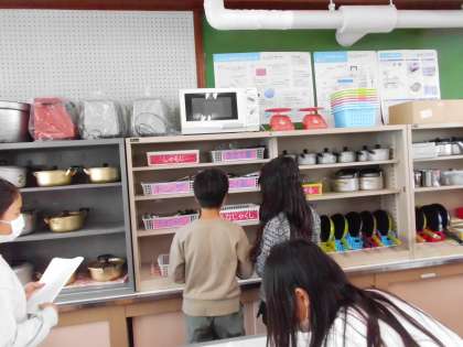家庭科室にどんな用具があるのかを調べにいきました。その後は、安全に清潔に用具を使うためにはどうすればいいかをみんなで考えました。