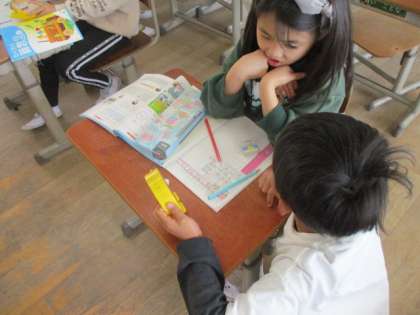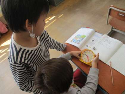時刻と時間の学習の復習をしました。教え合いながらがんばっています。