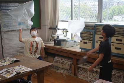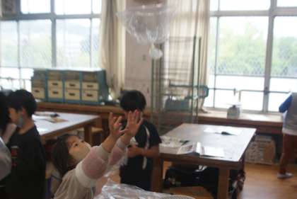 吹き上がる風の力で、ビニール袋を飛ばし、どんなものに見えるのか、イメージを膨らませました。袋を飛ばしながら、「鳥に見えた。」「クラゲに見えた。」などと想像することができました。