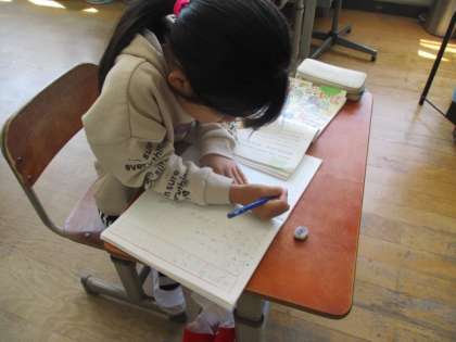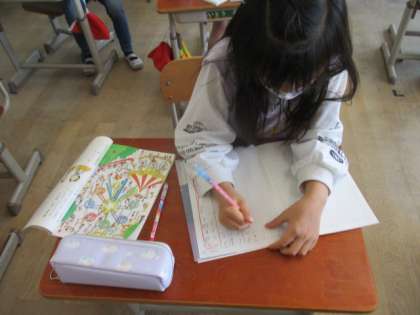 ともだちをさがそうの学習で、話を聞くときにだいじなことを考えました。実際に迷子のお知らせを聞いてメモをとる学習をしました。