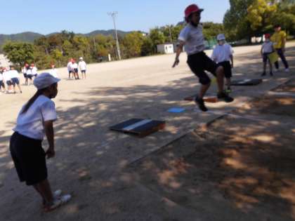 体育では、幅跳びの学習が始まりました。準備や記録の仕方などを確認した後に、実際に跳んでみました。助走の距離や空中動作など、どのようにすればより遠くまで跳ぶことができるのか考えていきます。