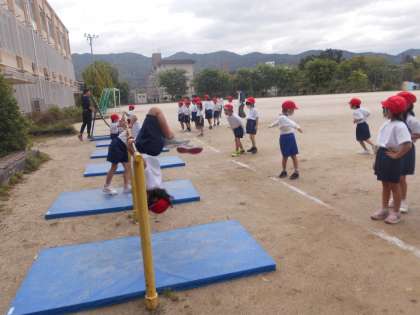 グループでマットを準備するところから始まり、友達の挑戦している様子を応援しながら順番を待ちます。
