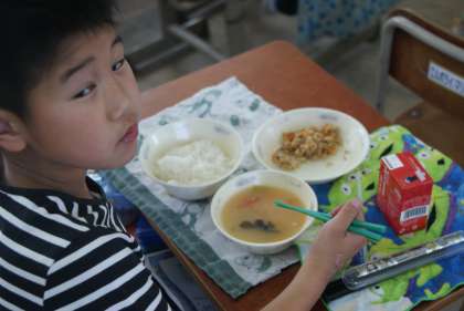 今日のメニューはトマトのだご汁でした。熊本の郷土料理で、給食調理員さんがホールトマトを混ぜた団子を一つ一つ手作りしてくれました。みんなおいしくいただきました。