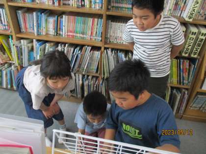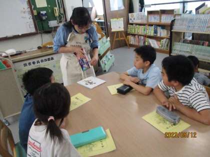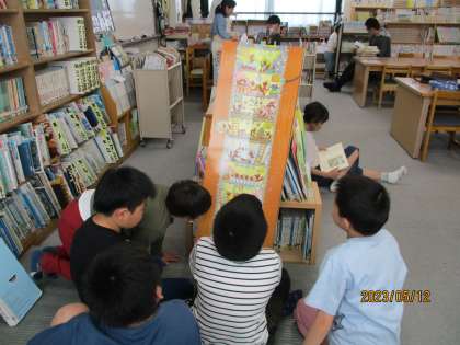 学校司書の先生に本の分類の仕方を教えていただきました。最後はなぞときにみんなでチャレンジ!みんなで協力してなぞとき大成功♪その後は大型絵本を仲良く読みました。