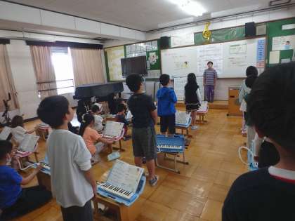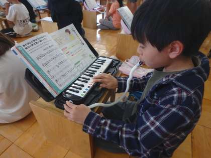 「いいことありそう」の曲を鍵盤ハーモニカに合わせて歌いました。「歌声と鍵盤ハーモニカとのバランスは…」と歌声と音色の響きを感じながら、お互いの歌声も聴き合って歌うことができました。