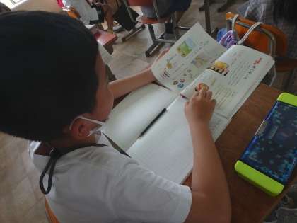 お礼の気持ちを伝える手紙の下書きをしました。子どもたちは、教科書を参考に季節のあいさつを考え、丁寧な言葉遣いで書くことを意識して取り組んでいました。