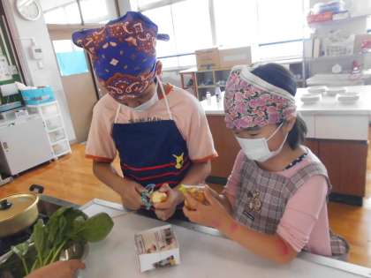 初めての調理実習!「青菜のおひたし」と「ゆでいも」を作りました。