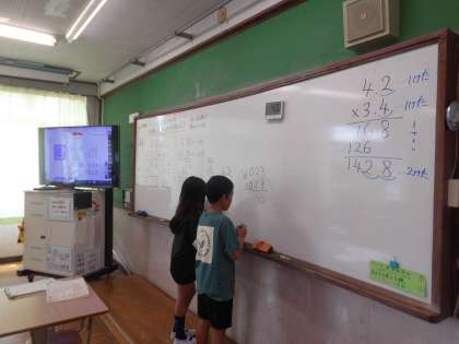 算数では、小数のかけ算の学習をしています。この日は筆算の仕方を考えました。これまで学習してきたことを生かして考えられていました!