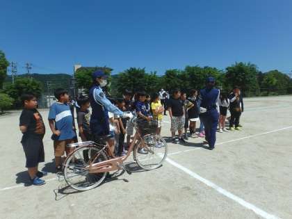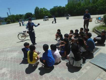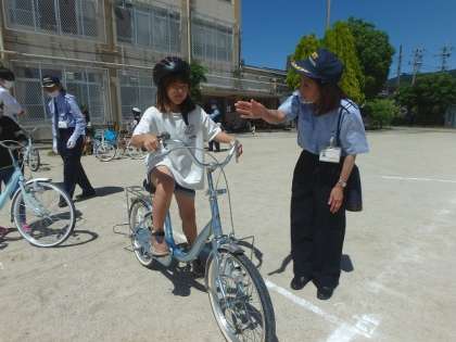 自転車安全教室がありました。山科警察署の方々、京都市行財政室サービス事業部の方々にお世話になり、自転車の安全な乗り方について教えていただきました。