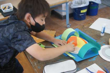 割りピンを使った回る仕組みを使って、作品をつくっています。回るものをイメージしながら画用紙やカップを取り付けています。完成が楽しみです。